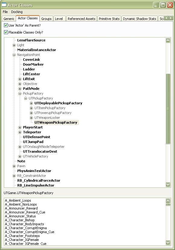 2) Now add a weapon in your map. To do so, go in the generic browser, click on the tab Actor Classes & select NavigationPoint \ PickupFactory \ UTPickupFactory \ UTWeaponPickupFactory & close the generic browser.