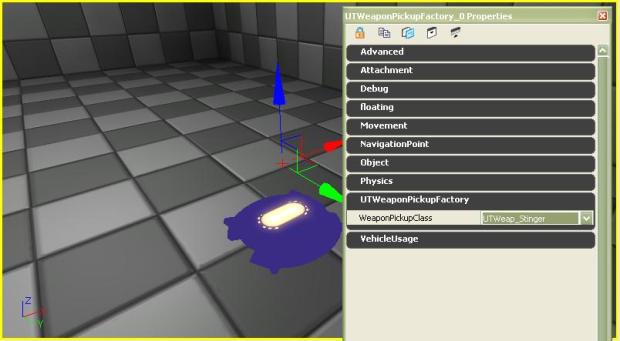 4) Once the weapon base as being placed, make sure it is selected, in the Editor menus click on View \ Actor Properties or double-click on it, or simply press F4. Now, we want to choose a weapon, so expand the UTWeaponPickupFactory category (which may be already opened) You can now pick a weapon in the list to the right of WeaponPickupClass and choosing one of the weapon. I choose the ‘UTWeap_Stinger’ for my example.