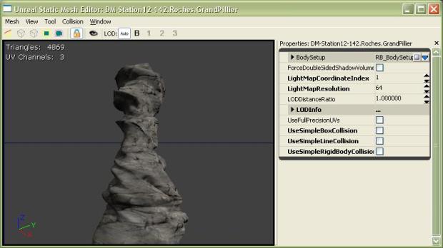 By default, most stock SM use a predefine collision model. Also, you must set the collision model manually for all imported SM. In this particular example, the rock default collision model don’t fit my needs, meaning that I need a collision model that is more ‘precise’ & that require using ‘per-poly’ collision. To accomplish this, open up te SM properties and make sure that ‘UseSimpleBoxCollision + UseSimpleLineCollision & finally UseSimpleRigidBodyCollision‘ are unchecked.
